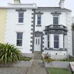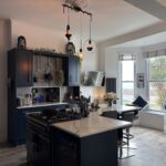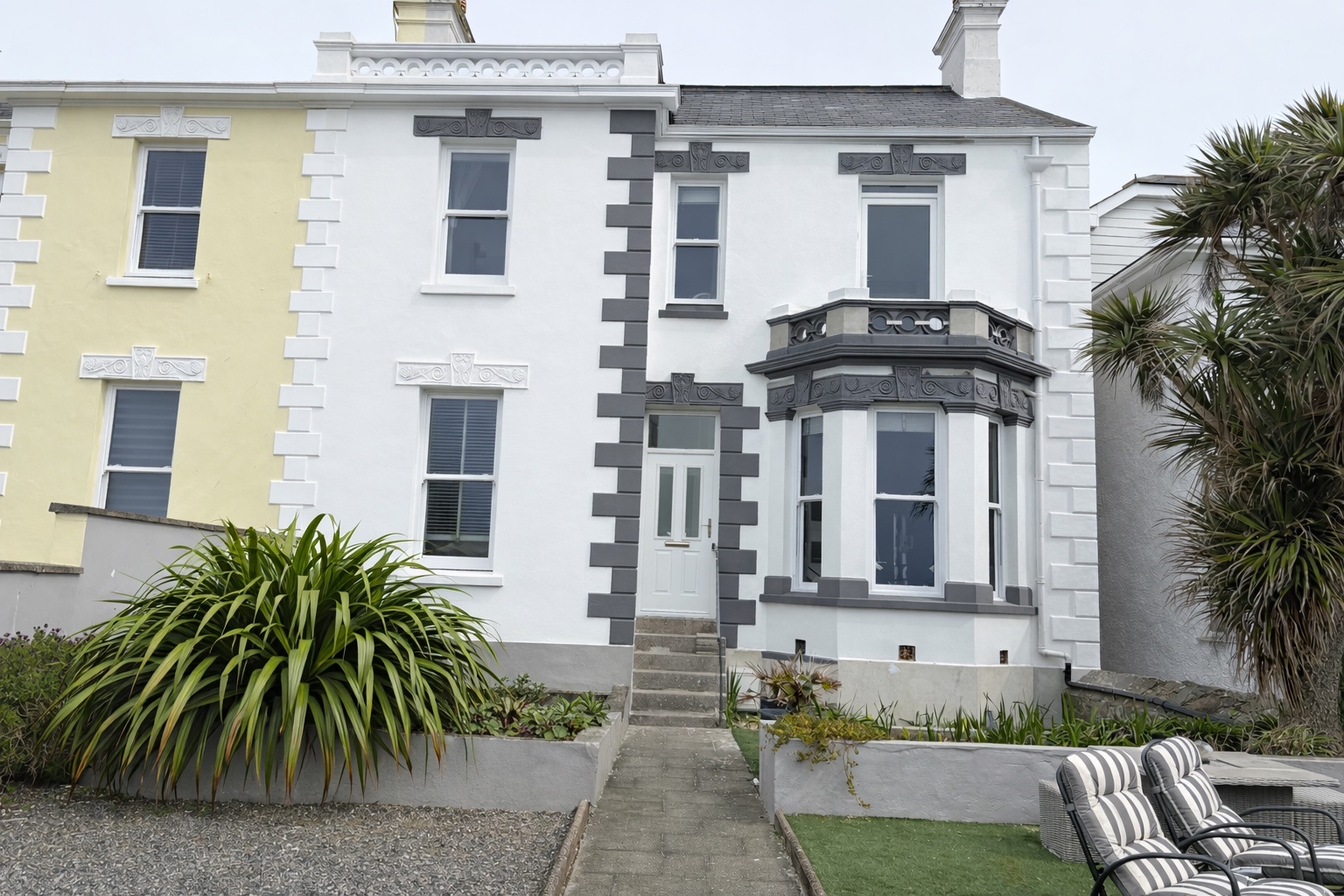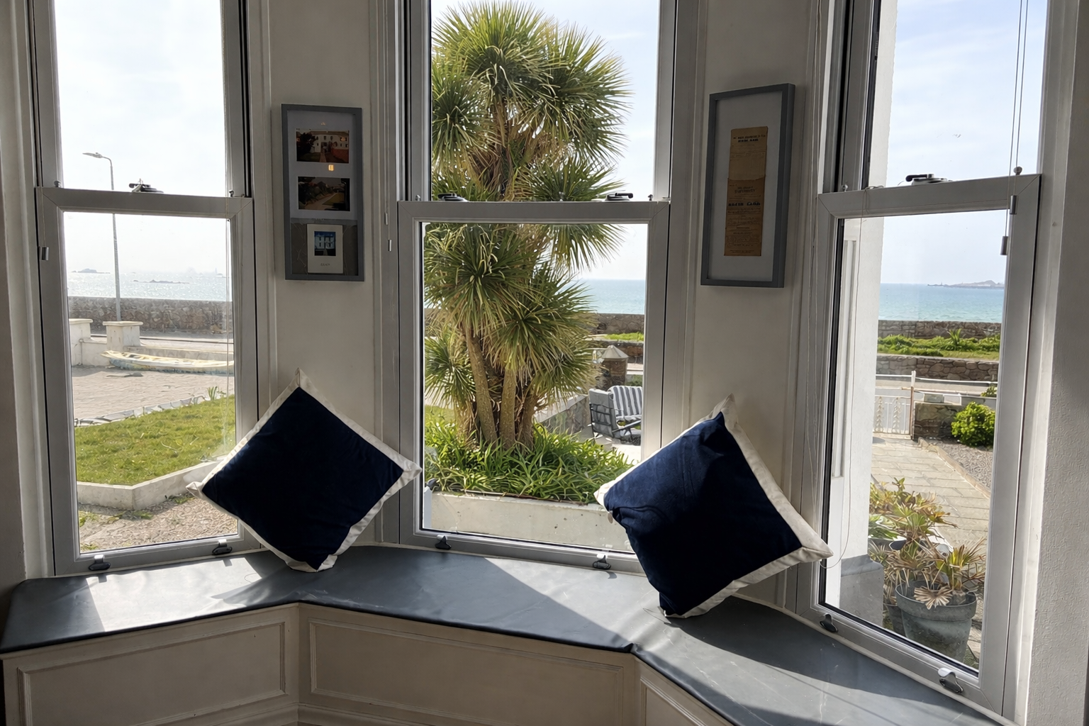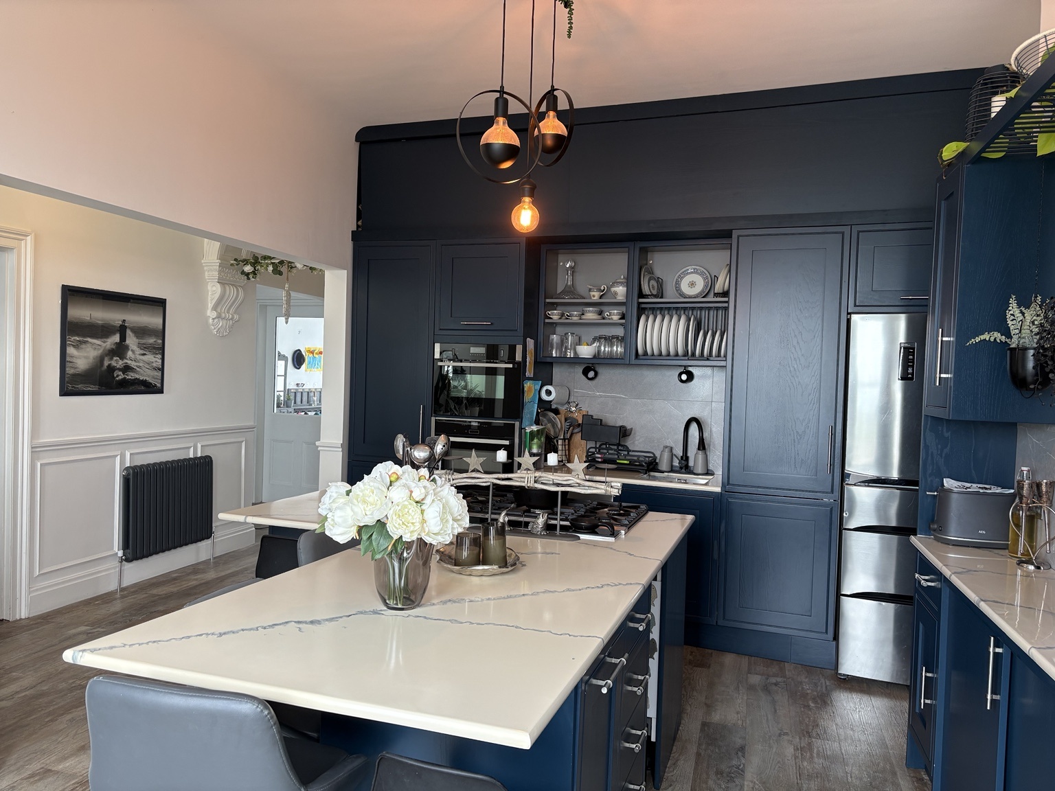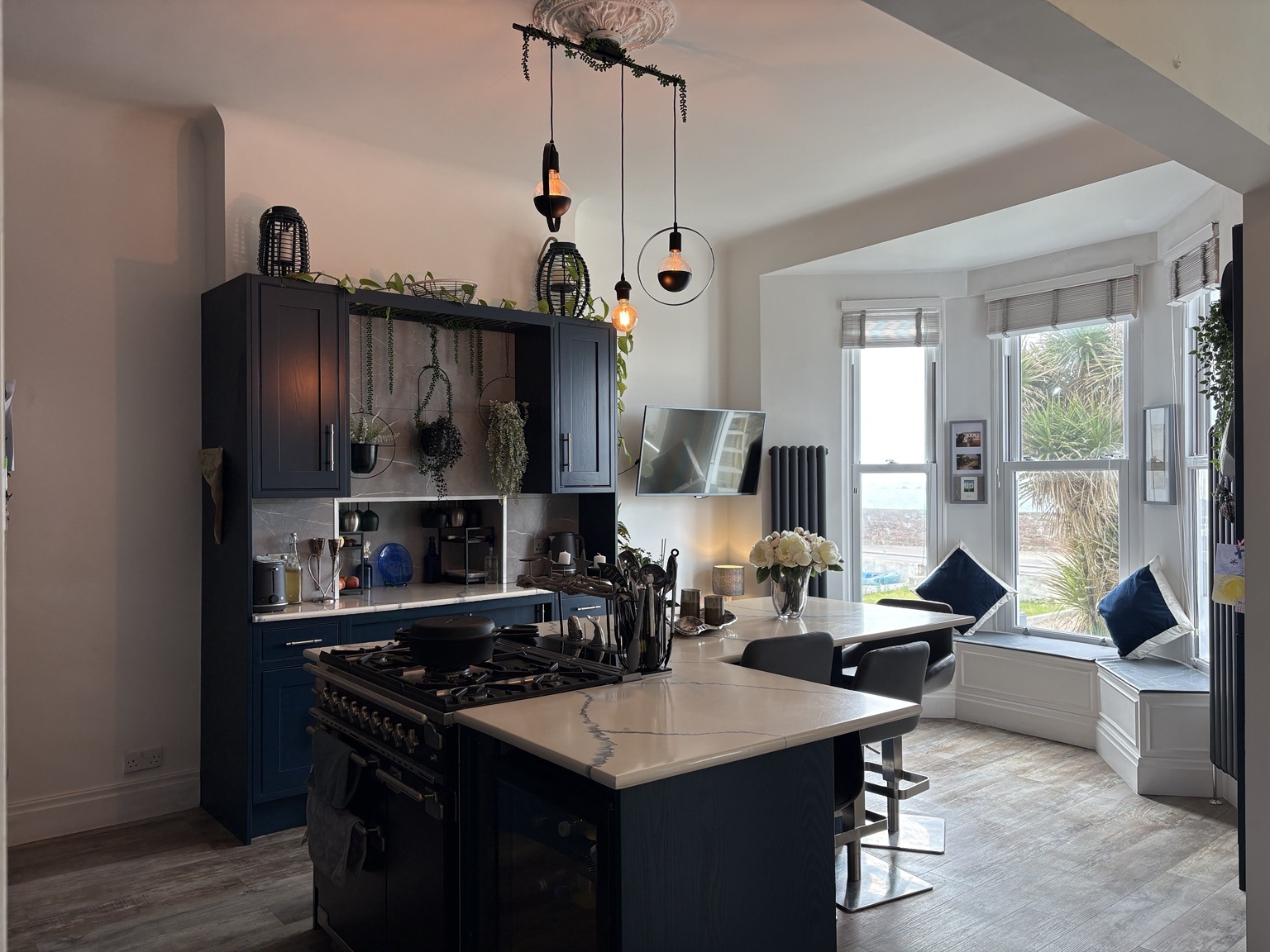 A large, modern kitchen/diner featuring a bay window and seating area with breathtaking views of the sea.